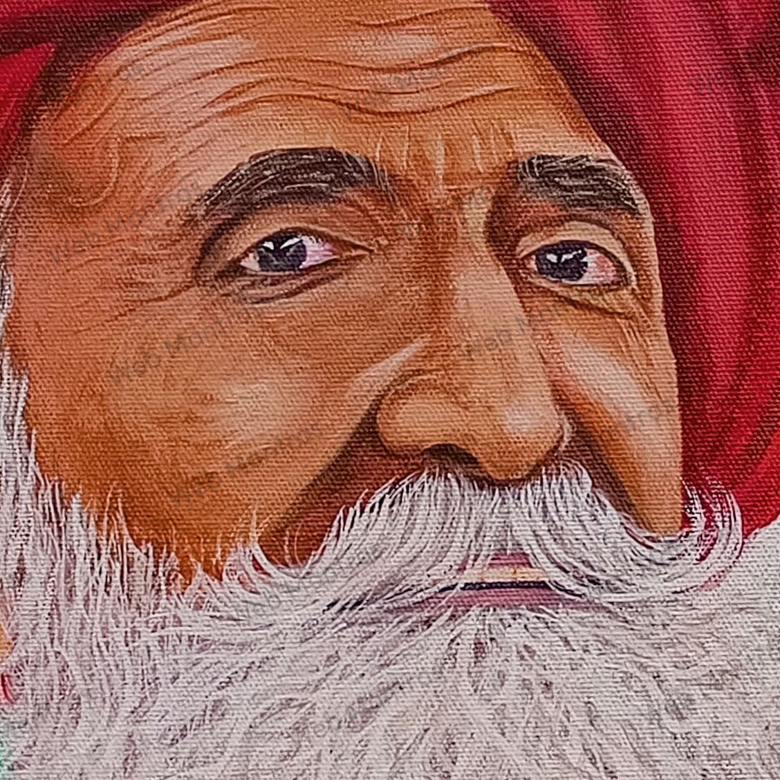Acrylic painting of a wise and dignified old man with a long white beard, mustache, and turban. His eyes are deep and expressive, and his face is lined with wisdom and experience. The painting is rendered in a realistic style, with a focus on capturing the unique features and character of the old man.